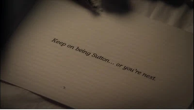 each other one "last" time and Sutton tells Emma theres no way her family will accept her after what Sutton tells them. But unkown to Emma, someone causes Sutton to drive her car into the lake where she was last seen in the car as it submerges, And "Annie" appears at Sutton (Emma)'s birthday party. Emma discovers Annie Rebecca Sewell was who she saw and Sutton didn't appear at the party. After finding the car Sutton was in at the lake but no Sutton, Emma becomes worried and she begins to believe Sutton is dead when she gets a gift, the gift was a piece of Sutton's dress she wore when she drowned with a note reading "Keep on being Sutton... or you're next." Ethan and Thayer think Sutton is pulling one of her Lying Games on Emma to get back at her in a more clever way. But after not hearing anything